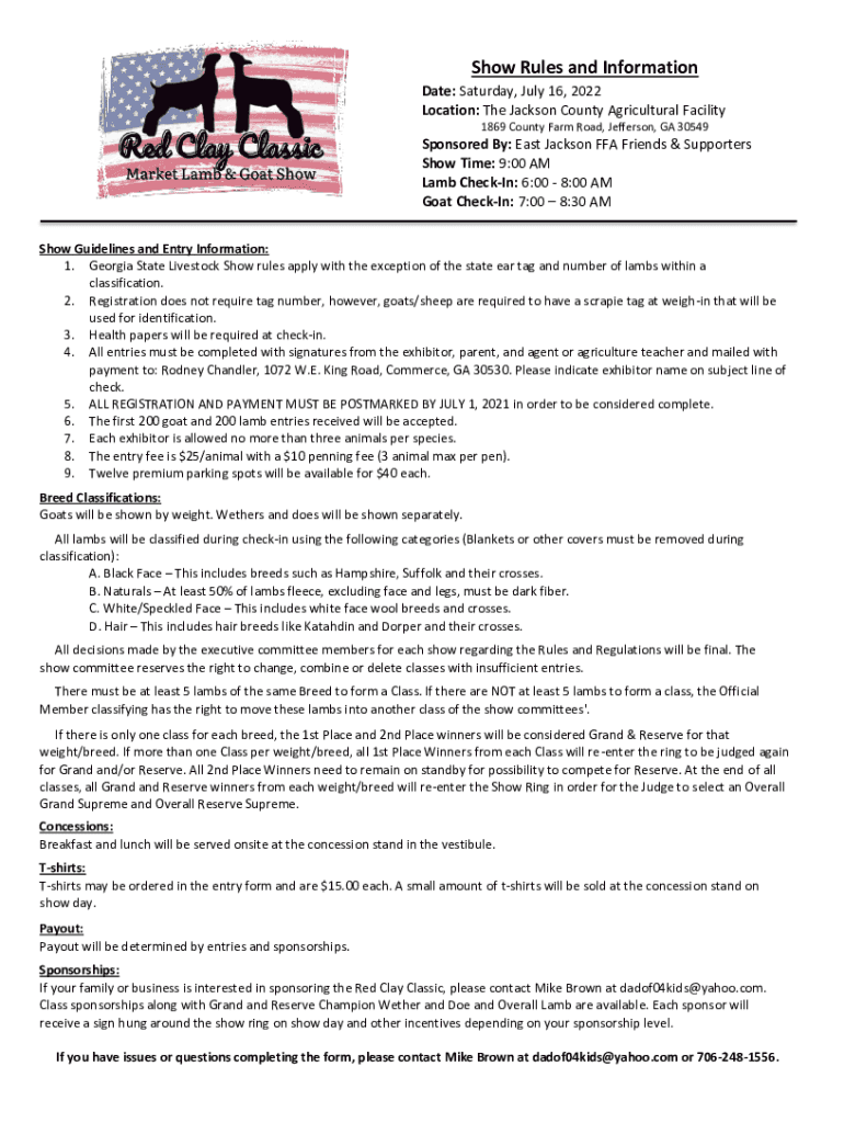 Show Rules and Information Date: Saturday, July 16, 2023 Location: The Jackson County Agricultural Facility 1869 County Farm Road, Jefferson, GA 30549Sponsored By: East Jackson FFA Friends & Supporters