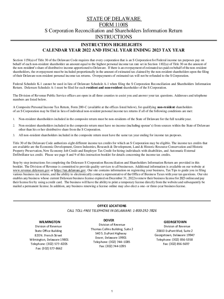 STATE OF DELAWARE FORM 1100S S Corporation Reconciliation and Shareholders Information Return INSTRUCTIONS INSTRUCTION HIGHLIGHTS CALENDAR YEAR 2022 AND FISCAL YEAR ENDING 2023 TAX YEAR Section 1158(a)