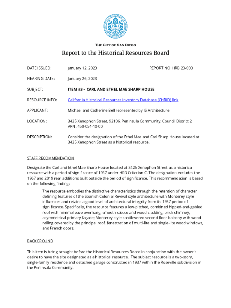 The City of San DiegoReport to the Historical Resources Board DATE ISSUED:January 12, 2023REPORT NO. HRB 23003HEARING DATE:January 26, 2023SUBJECT:ITEM #3 CARL AND ETHEL MAE SHARP HOUSERESOURCE INFO:California