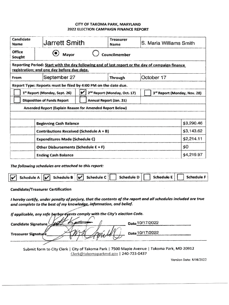 CIA OF TACOMA PARK, MARY\” AND 2022 ELECTION CAMPAIGN FINANCE REPORT Candidate NameTreasurer Name Jarrett SmithOffice SoughtCMayoraorn.ilmemberReporting Period: Start with the DAV following end