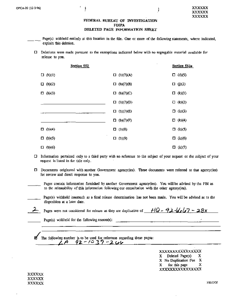 OPCA20 :2396!g! XXX\” XXX.XXX OF INVESTIGATIONFEDERAL BUREAU DELETED AGEFIPH INFORNIATIONSHEETPage s! Withheld entirely at this location in the LE. One or more of the following statements, where