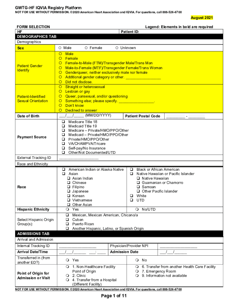 DWIGHT VIA Registry Platform NOT FOR USE WITHOUT PERMISSION. 2020 American Heart Association and VIA. For questions, call 8885266700August 2021 FORM SELECTION HF DEMOGRAPHICS TAB Demographics Patient