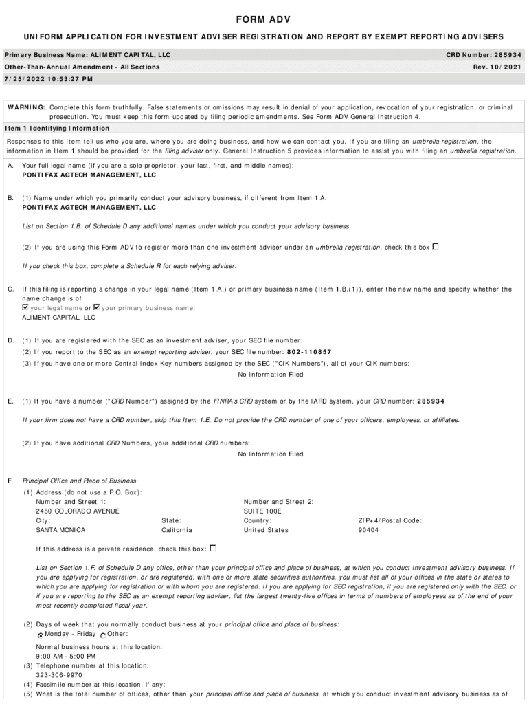 FORM ADV UNIFORM APPLICATION FOR INVESTMENT ADVISER REGISTRATION AND REPORT BY EXEMPT REPORTING ADVISERS Primary Business Name: ALIMENT CAPITAL, LLC CRD Number: 285934OtherThanAnnual Amendment All