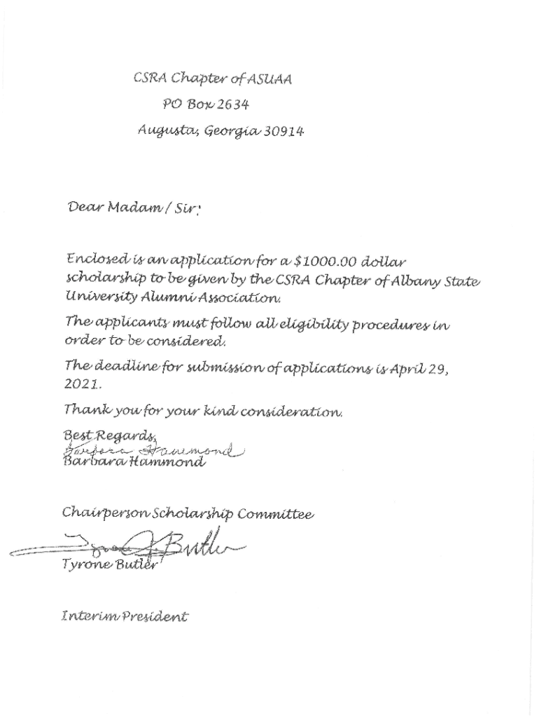 CSA Chapter fauna PO Box 2634 Augusta, Georgia 30914Dear Madam / Enclosed is an application for a $1000.00 dollar scholarship to be given by the CSA Chapter of Albany State University AumniAssociation.