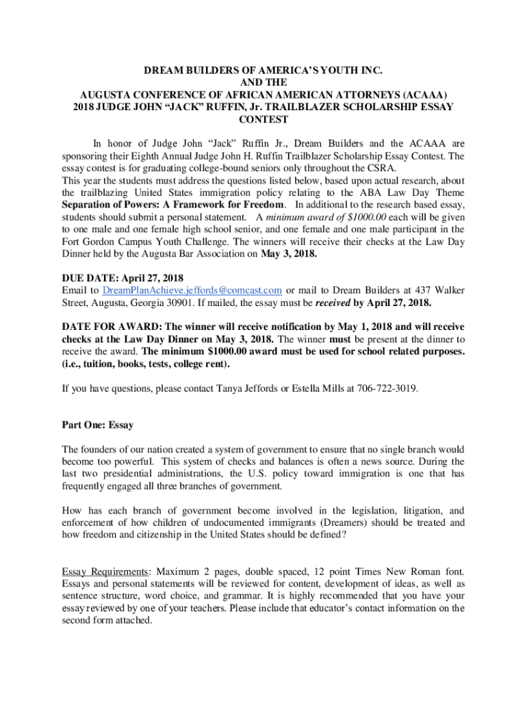 DREAM BUILDERS OF AMERICAS YOUTH INC. AND THE AUGUSTA CONFERENCE OF AFRICAN AMERICAN ATTORNEYS (AAAA) 2018 JUDGE JOHN JACK MUFFIN, Jr. TRAILBLAZER SCHOLARSHIP ESSAY CONTEST In honor of Judge John