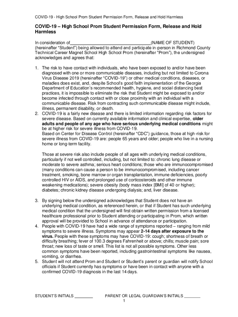 COVID-19 High School Prom Student Permission Form, Release and Hold HarmlessCOVID19 High School Prom Student Permission Form, Release and Hold Harmless In consideration of (NAME OF STUDENT) (hereinafter