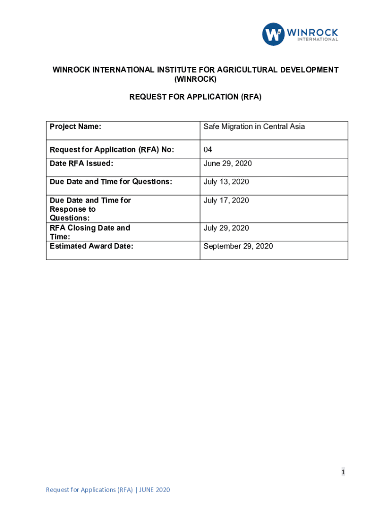 WINDSOCK INTERNATIONAL INSTITUTE FOR AGRICULTURAL DEVELOPMENT (WINDSOCK) REQUEST FOR APPLICATION (RFA)Project Name:Safe Migration in Central AsiaRequest for Application (RFA) No:04Date RFA Issued:June