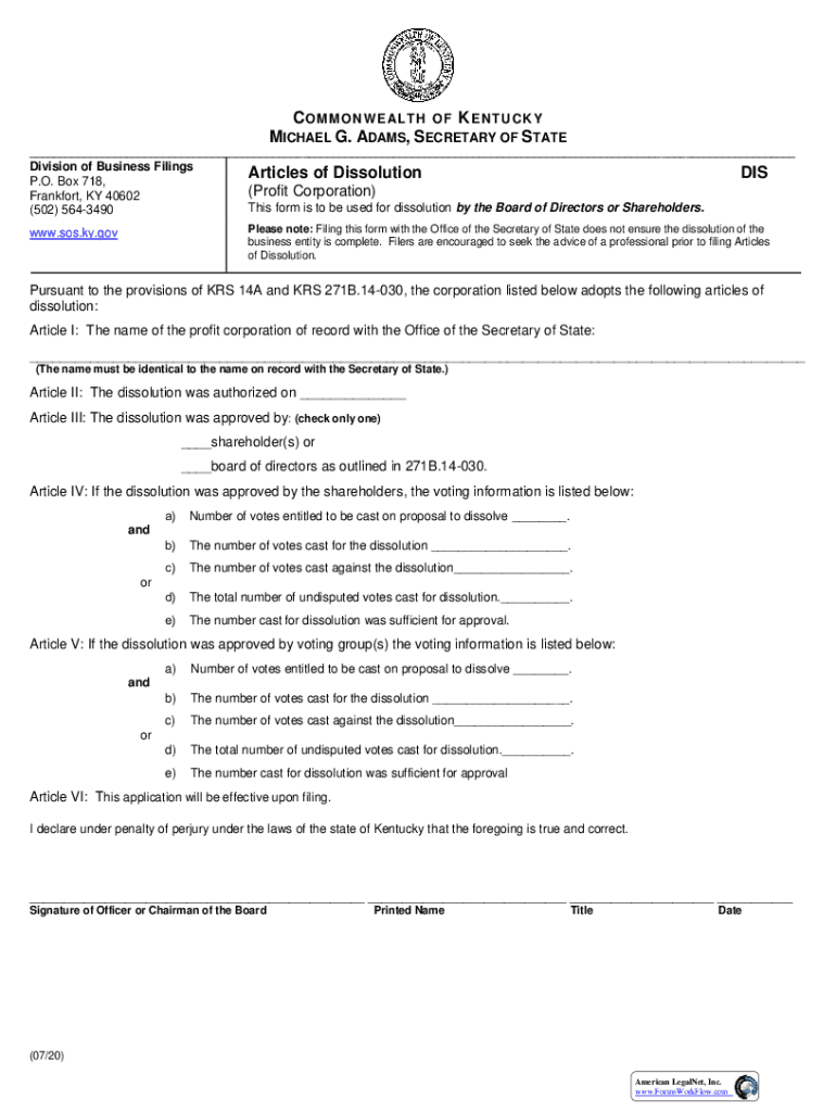 C OM M ON W E AL T H O F K E NT U CK Y MICHAEL G. ADAMS, SECRETARY OF STATE ___Division of Business Filings P.O. Box 718, Frankfort, KY 40602 (502) 5643490Articles of Dissolution.SOS.KY.please note: