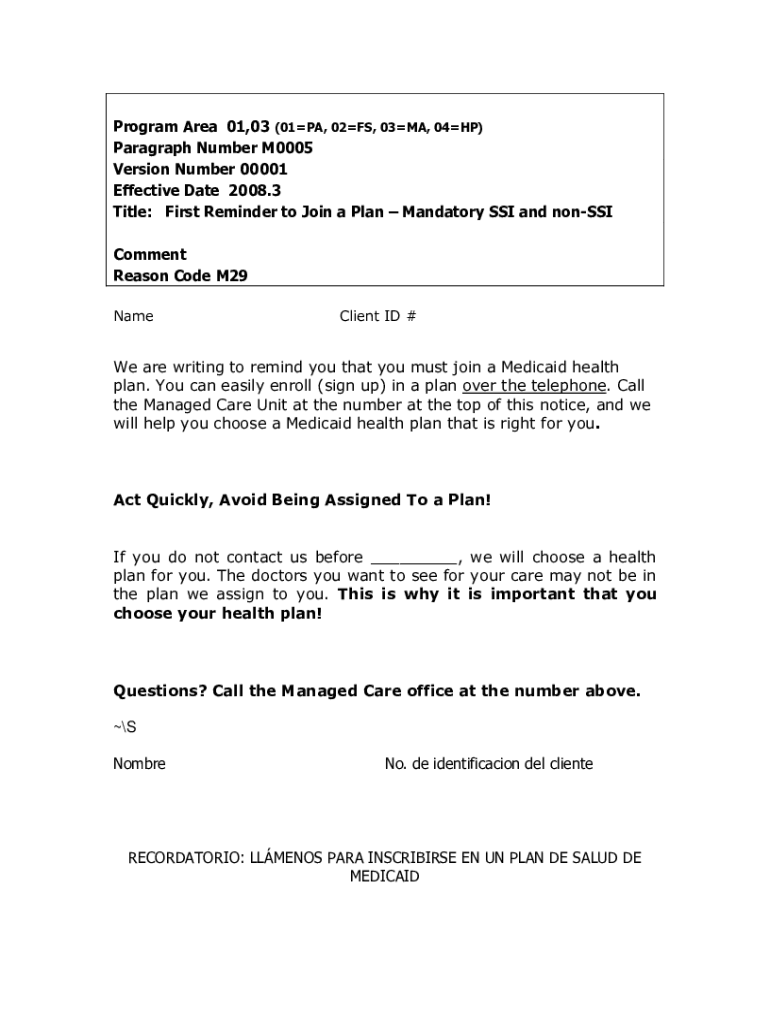 Program Area 01,03 (01PA, 02FS, 03MA, 04HP) Paragraph Number M0005 Version Number 00001 Effective Date 2008.3 Title: First Reminder to Join a Plan Mandatory SSI and nonSSI Comment Reason Code M29