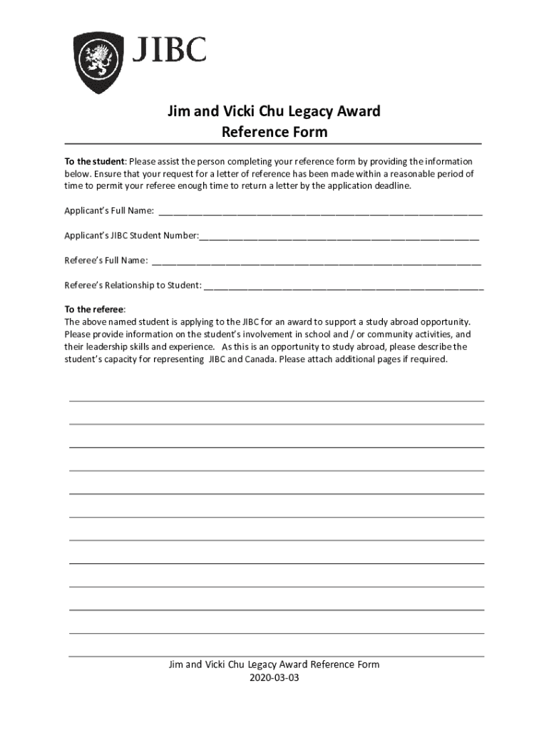 Jim and Vicki Chu Legacy Award Reference Form To the student: Please assist the person completing your reference form by providing the information below. Ensure that your request for a letter of reference