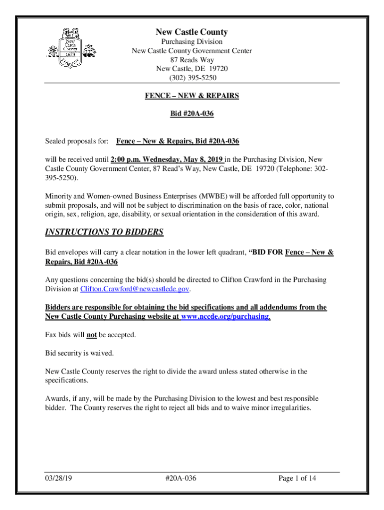 New Castle County Purchasing Division New Castle County Government Center 87 Reads Way New Castle, DE 19720 (302) 3955250 FENCE NEW & REPAIRS Bid #20A036Sealed proposals for:Fence New & Repairs, Bid