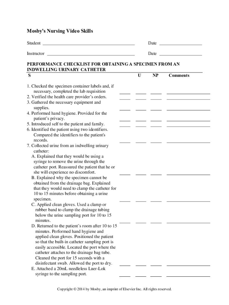 Cosby\'s Nursing Video Skills Student ___Date ___Instructor ___Date ___PERFORMANCE CHECKLIST FOR OBTAINING A SPECIMEN FROM AN INDWELLING URINARY CATHETER S U NP Comments 1. Checked the specimen container