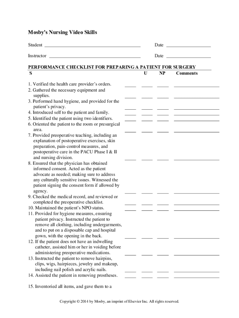 Cosby\'s Nursing Video Skills Student ___Date ___Instructor ___Date ___PERFORMANCE CHECKLIST FOR PREPARING A PATIENT FOR SURGERY S U NP Comments 1. Verified the health care providers orders. 2. Gathered