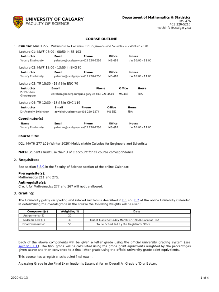 Department of Mathematics & Statistics MS 476 403 2205210 mathinfo@ucalgary.caCOURSE OUTLINE 1. Course: MATH 277, Multivariable Calculus for Engineers and Scientists Winter 2020 Lecture 01: WWF 08:00
