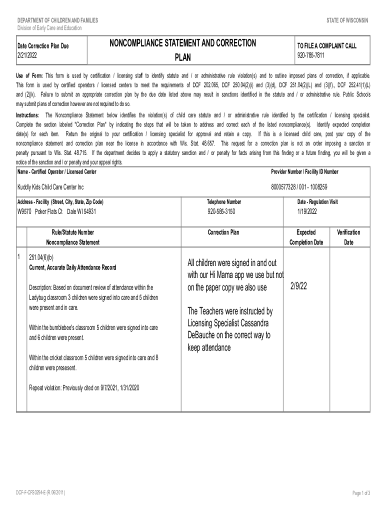 DEPARTMENT OF CHILDREN AND FAMILIES Division of Early Care and Educational Correction Plan Due 2/21/2022STATE OF WISCONSINNONCOMPLIANCE STATEMENT AND CORRECTION PLANT FILE A COMPLAINT CALL 9207857811Use