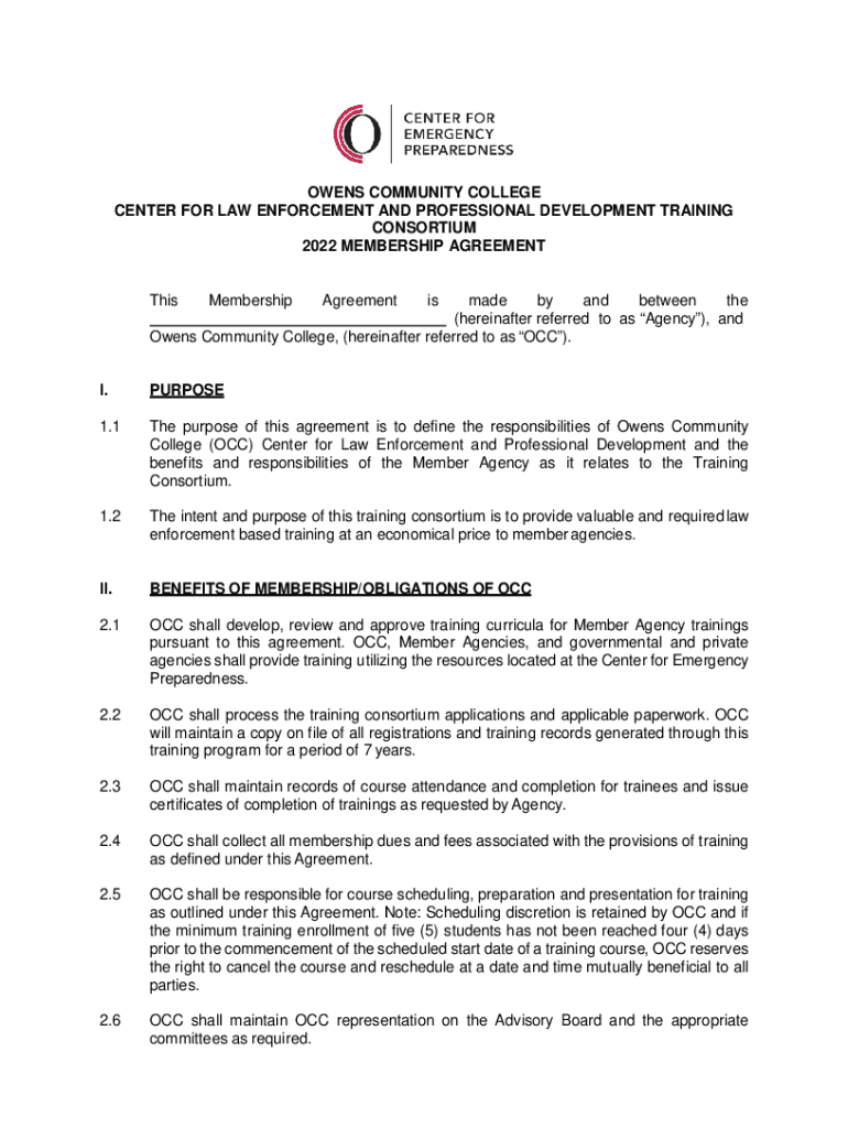 OWENS COMMUNITY COLLEGE CENTER FOR LAW ENFORCEMENT AND PROFESSIONAL DEVELOPMENT TRAINING CONSORTIUM 2022 MEMBERSHIP AGREEMENT ThisMembershipAgreementismade by and between the (hereinafter referred
