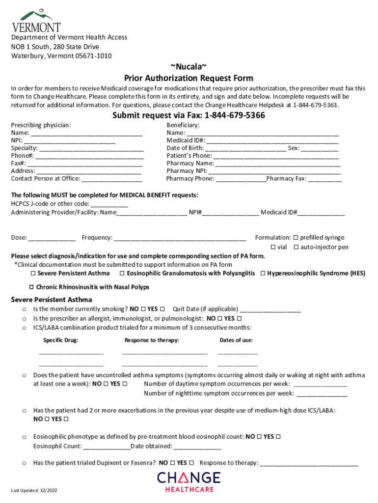 Department of Vermont Health Access NOB 1 South, 280 State Drive Waterbury, Vermont 056711010Nucala Prior Authorization Request Form In order for members to receive Medicaid coverage for medications