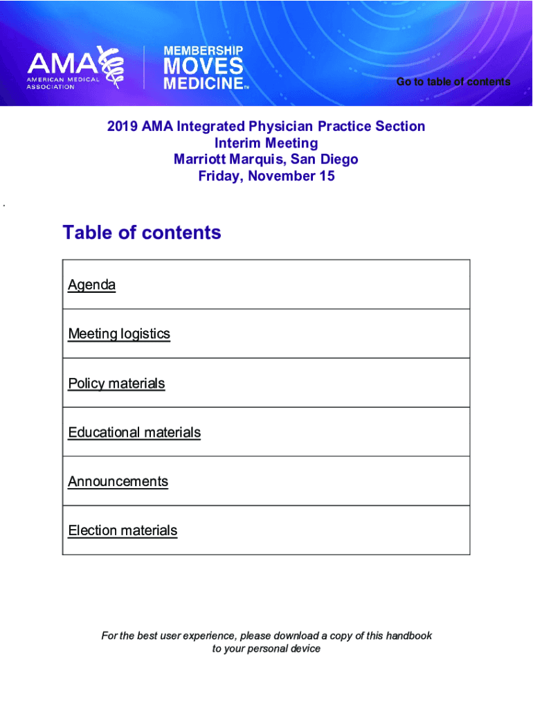 Go to table of contents2019 AMA Integrated Physician Practice Section Interim Meeting Marriott Marquis, San Diego Friday, November 15. Table of contents Agenda Meeting logistics Policy materials Educational