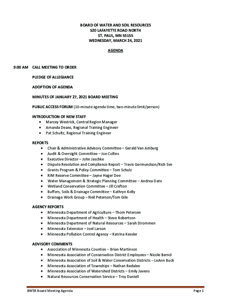 BOARD OF WATER AND SOIL RESOURCES 520 LAFAYETTE ROAD NORTH ST. PAUL, MN 55155 WEDNESDAY, MARCH 24, 2021 AGENDA9:00 AM CALL MEETING TO ORDER PLEDGE OF ALLEGIANCE ADOPTION OF AGENDA MINUTES OF JANUARY