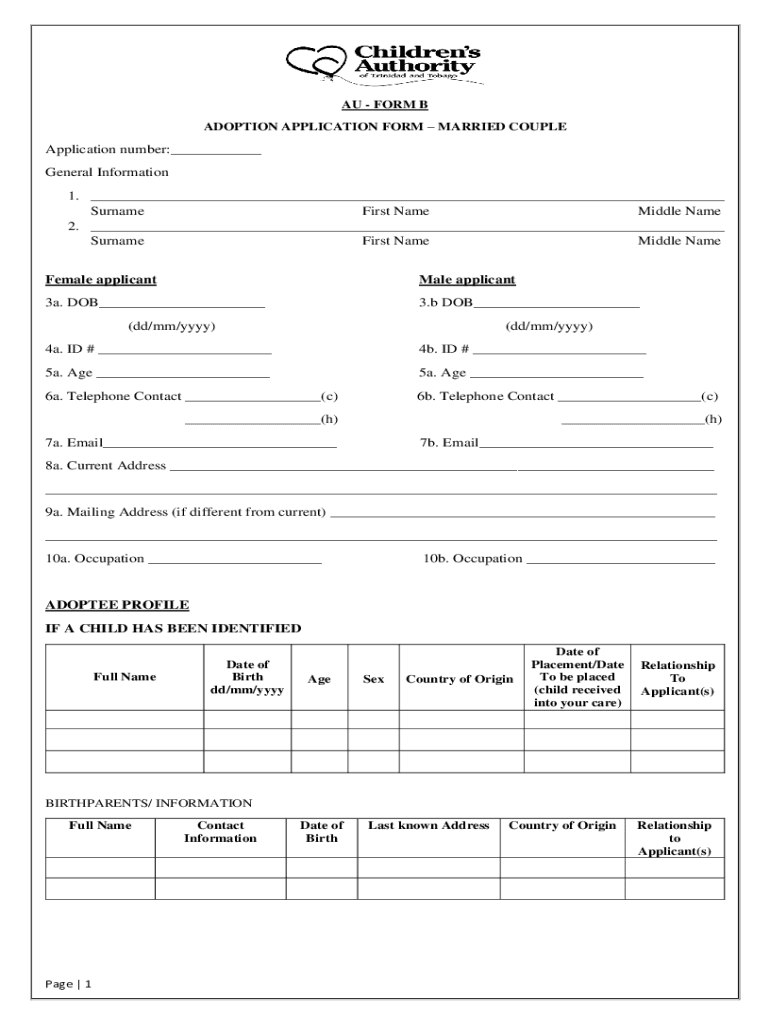 AU FORM B ADOPTION APPLICATION FORM MARRIED COUPLEApplication number:___ General Information 1. ___ Surname First Name Middle Name 2. ___ Surname First Name Middle Name Female applicant Male applicant3a.