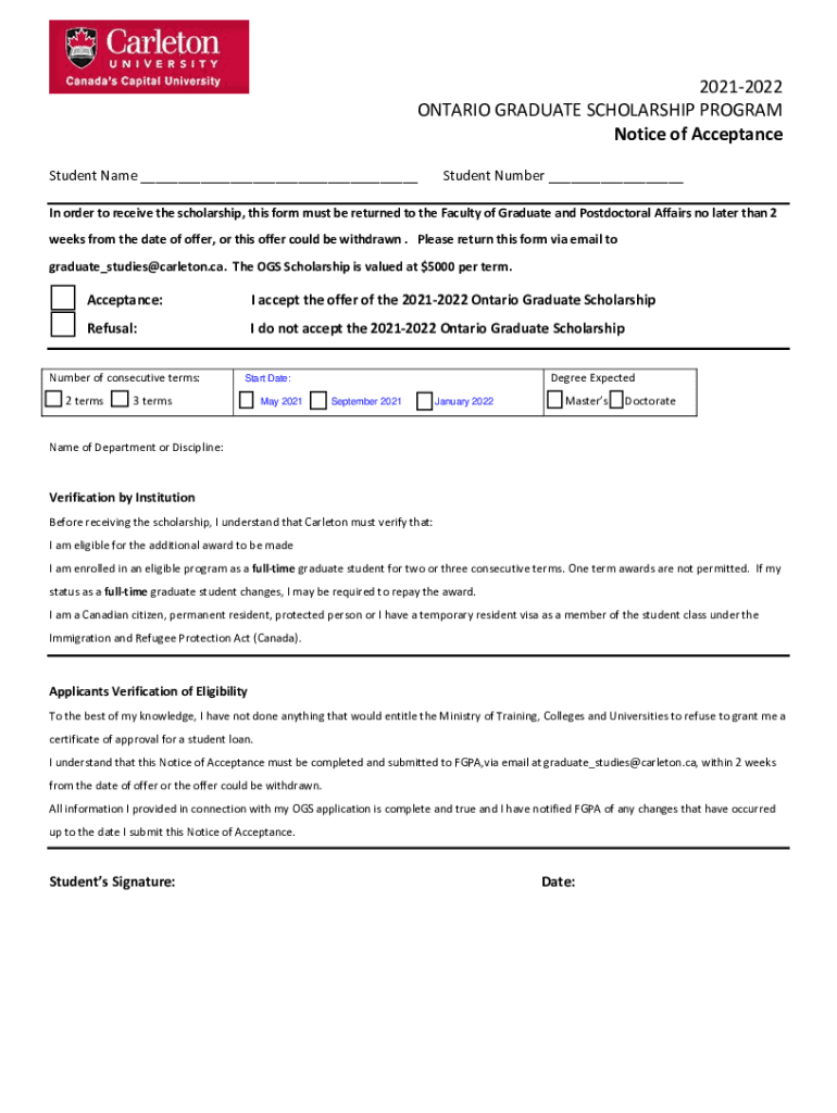 Get the free Notice of Acceptance ONTARIO GRADUATE SCHOLARSHIP ... - gradstudents carleton