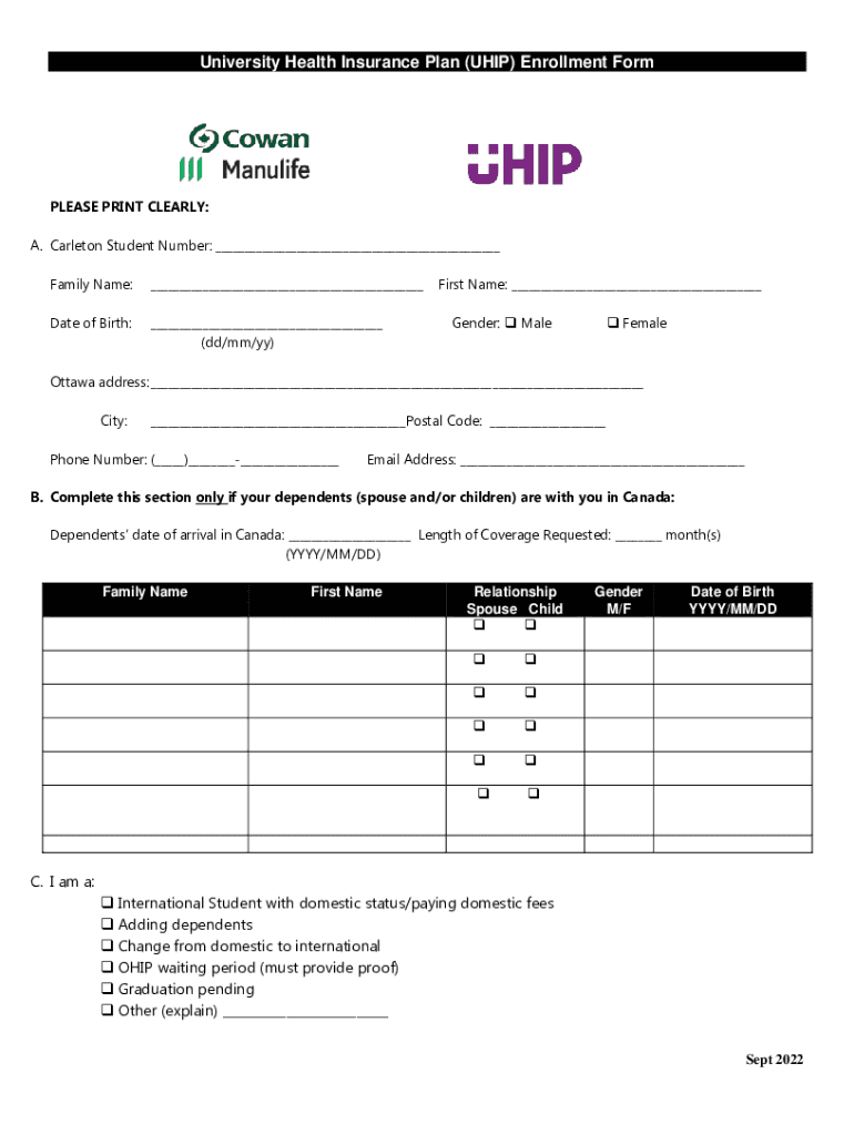 University Health Insurance Plan (SHIP) Enrollment Formulas PRINT CLEARLY: A. Carleton Student Number: ___ Family Name:___Date of Birth:___ (dd/mm/by)First Name: ___ Gender: Male Female Ottawa address: