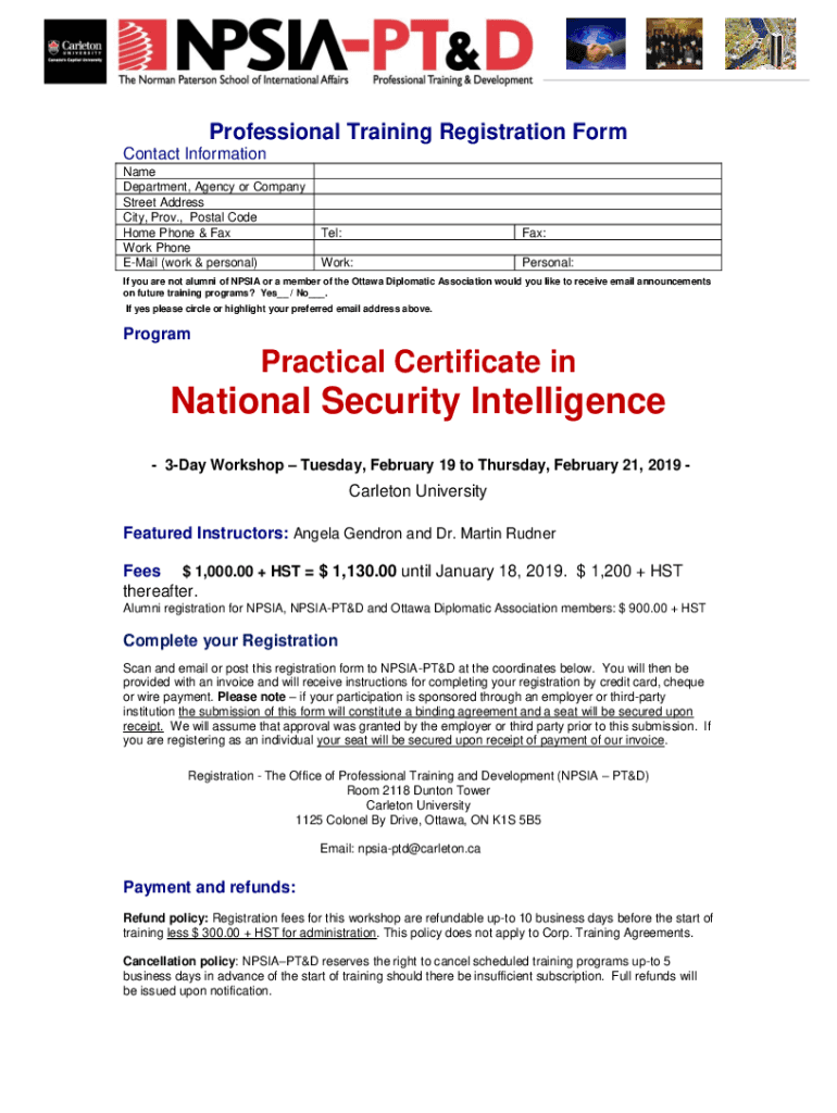 Professional Training Registration Form Contact Information Name Department, Agency or Company Street Address City, Prov., Postal Code Home Phone & Fax Work Phone Email (work & personal)Tel:Fax:Work:Personal:If