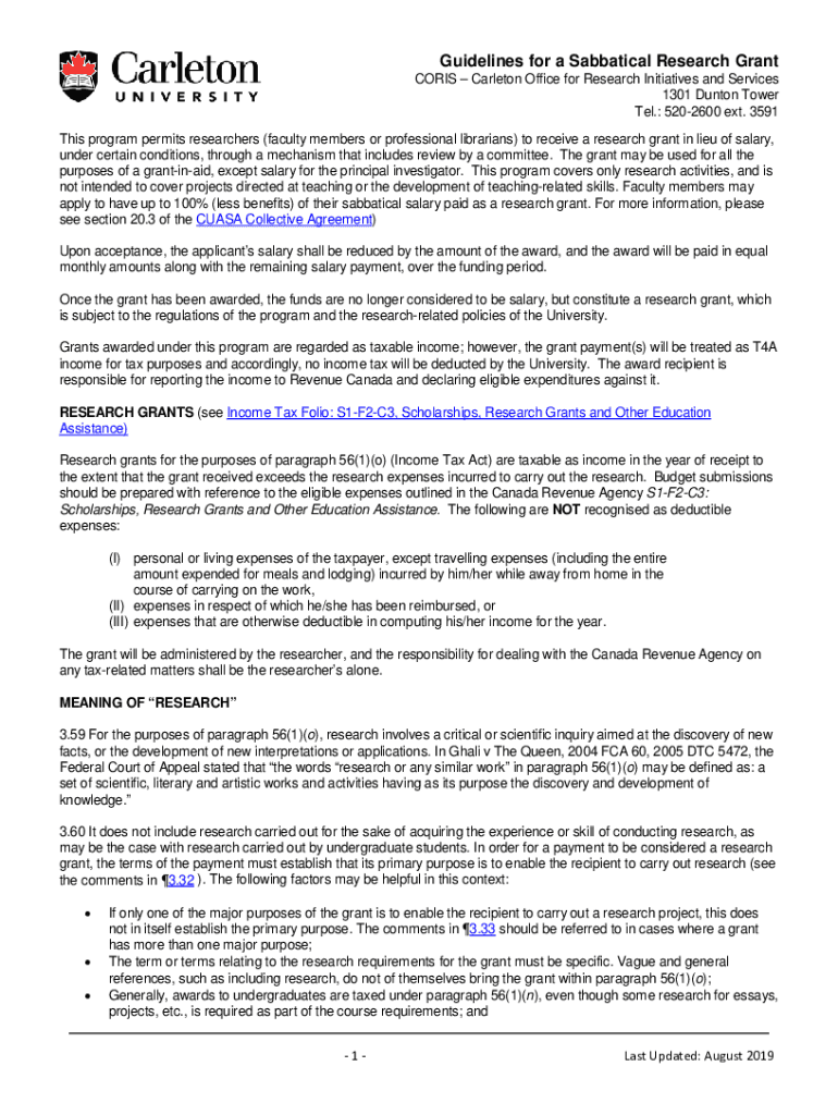 Guidelines for a Sabbatical Research Grant CHRIS Carleton Office for Research Initiatives and Services 1301 Denton Tower Tel.: 5202600 ext. 3591 This program permits researchers (faculty members or
