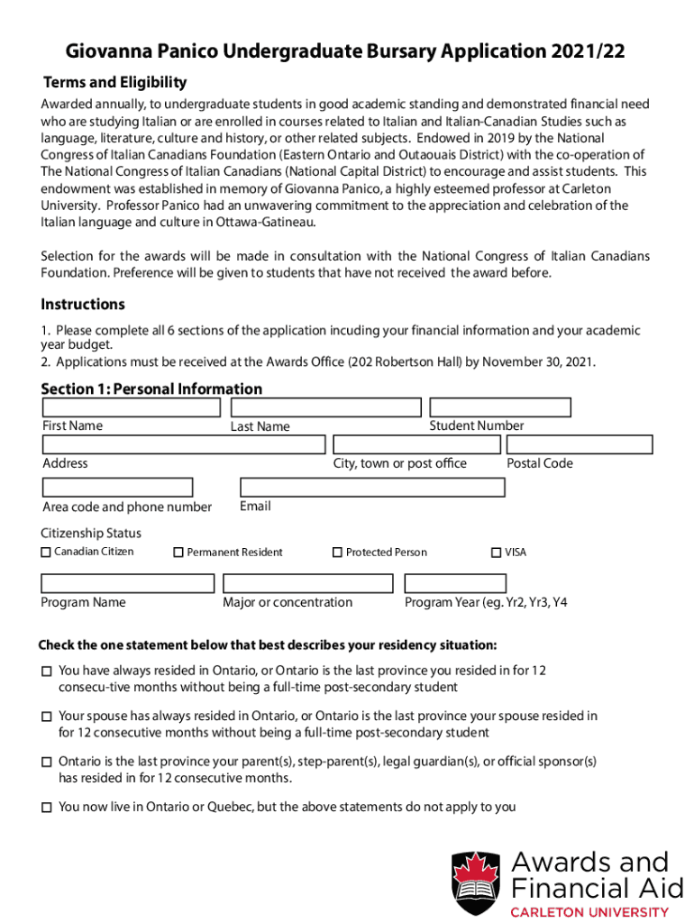 Obtain the application form for the Giovanna Panico Memorial Bursary from Carleton University.