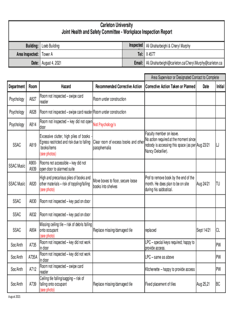 Carleton University Joint Health and Safety Committee Workplace Inspection Report Building: Area Inspected: Date:Inspected by: Tel:Lobe Building Tower A August 4, 2021Email:Ali Ghaharbeighi & Cheryl