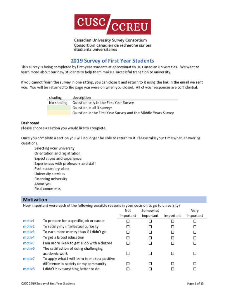 2019 Survey of First Year Students This survey is being completed by first year students at approximately 30 Canadian universities. We want to learn more about our new students to help them make a