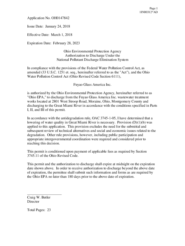 Page 1 1IN00312×Application No. OH0147842 Issue Date: January 24, 2018, Effective Date: March 1, 2018, Expiration Date: February 28, 2023, Ohio Environmental Protection Agency Authorization to Discharge