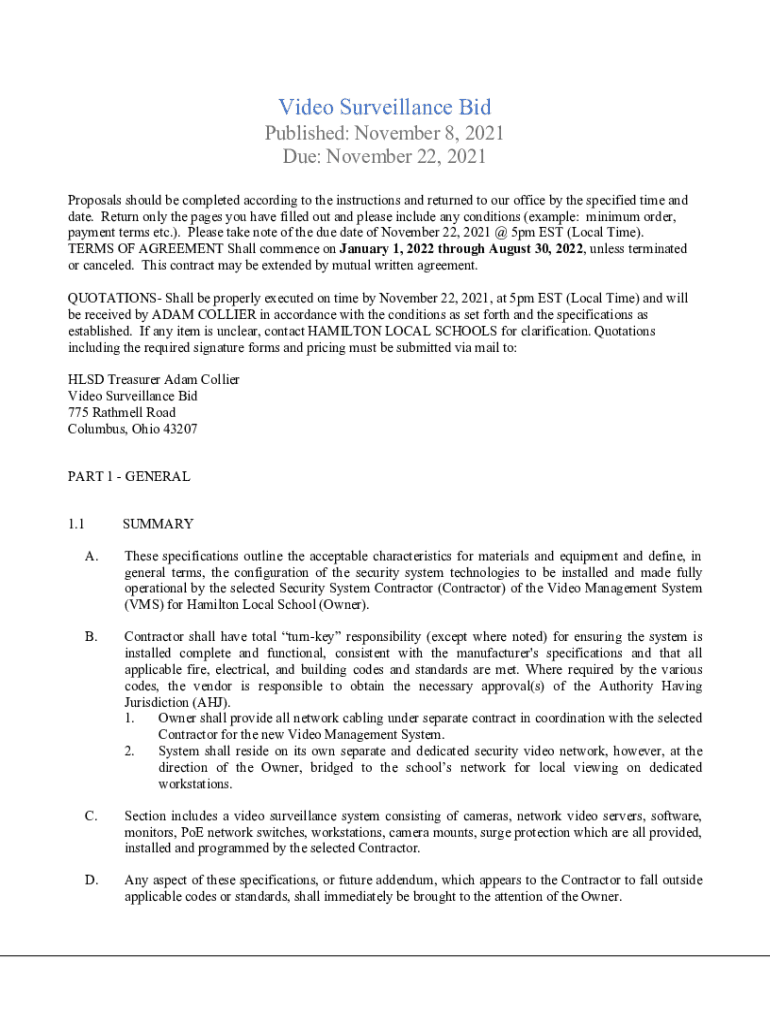 Video Surveillance Bid Published: November 8, 2021, Due: November 22, 2021, Proposals should be completed according to the instructions and returned to our office by the specified time and date. Return