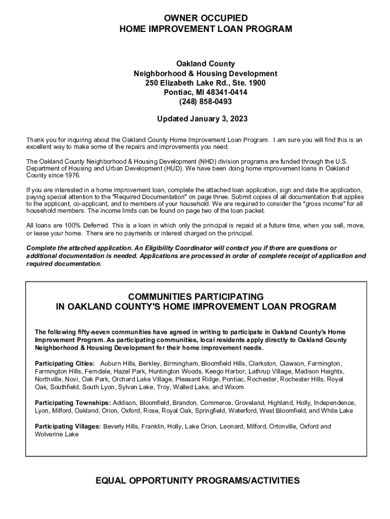 OWNER OCCUPIED HOME IMPROVEMENT LOAN PROGRAM Oakland County Neighborhood & Housing Development 250 Elizabeth Lake Rd., Ste. 1900 Pontiac, MI 483410414 (248) 8580493 Updated January 3, 2023, Thank