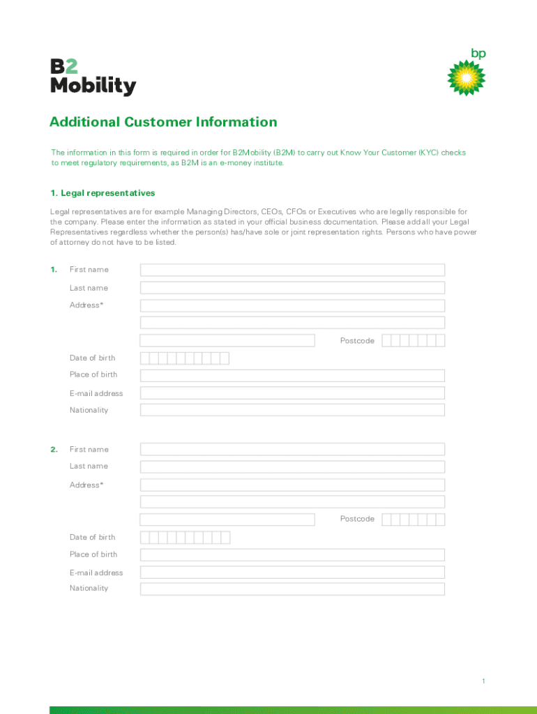 Additional Customer Information The information in this form is required in order for B2Mobility (B2M) to carry out Know Your Customer (KYC) checks to meet regulatory requirements, as B2M is a money