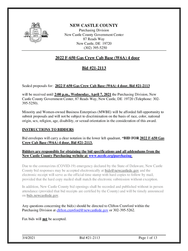 NEW CASTLE COUNTY Purchasing Division New Castle County Government Center 87 Reads Way New Castle, DE 19720 (302) 39552502022 F650 Gas Crew Cab Base (W6A) 4 door Bid #212113Sealed proposals for: 2022