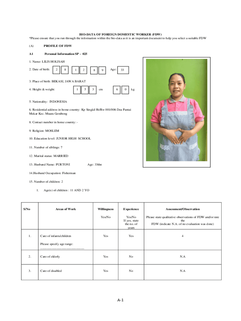 GEODATA OF FOREIGN DOMESTIC WORKER (FEW) *Please ensure that you run through the information within the biodata as it is an important document to help you select a suitable FEW (A)PROFILE OF FDWA1Personal