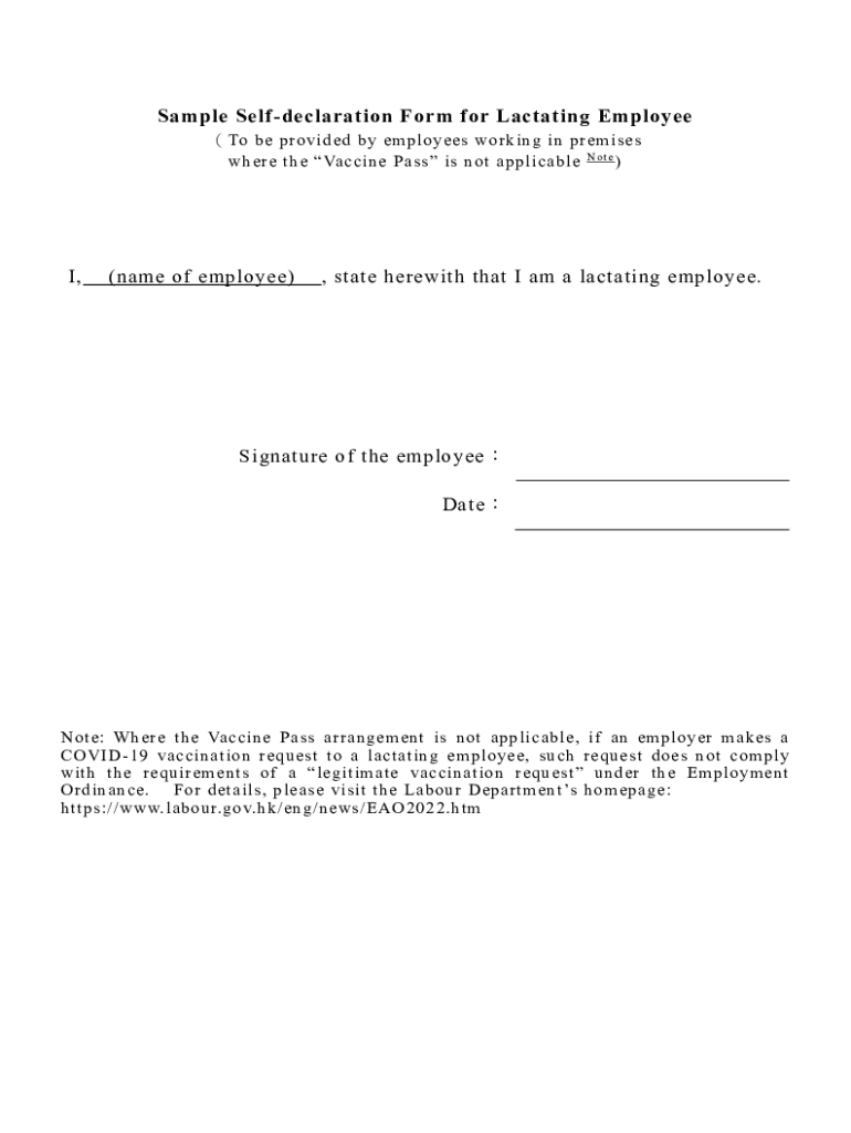 Get the free Sample Self-declaration Form for Lactating Employee