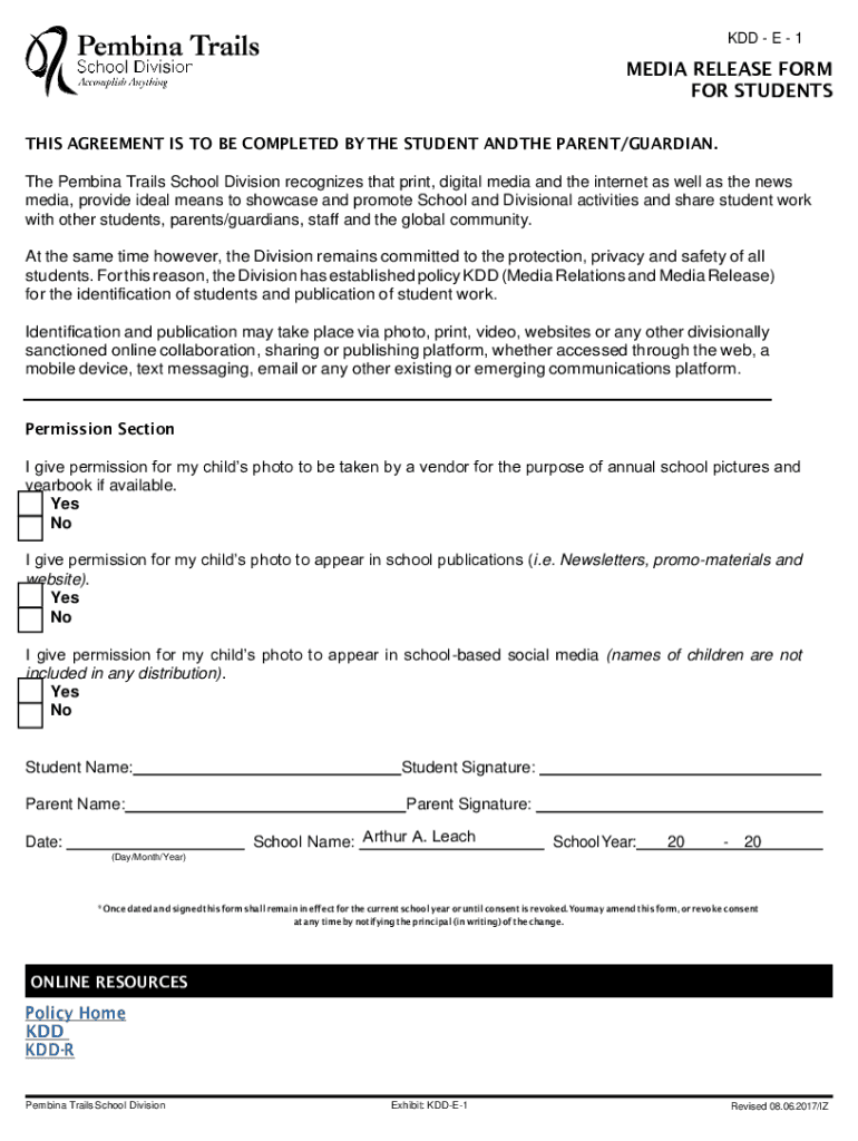 ADD E 1MEDIA RELEASE FORM FOR STUDENTS THIS AGREEMENT IS TO BE COMPLETED BY THE STUDENT AND THE PARENT/GUARDIAN. The Remain Trails School Division recognizes that print, digital media and the internet