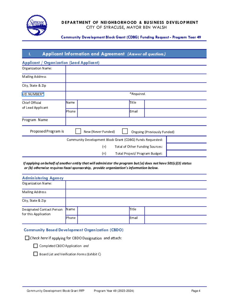 Obtain the City of Syracuse CDBG application form from the official website or designated office.