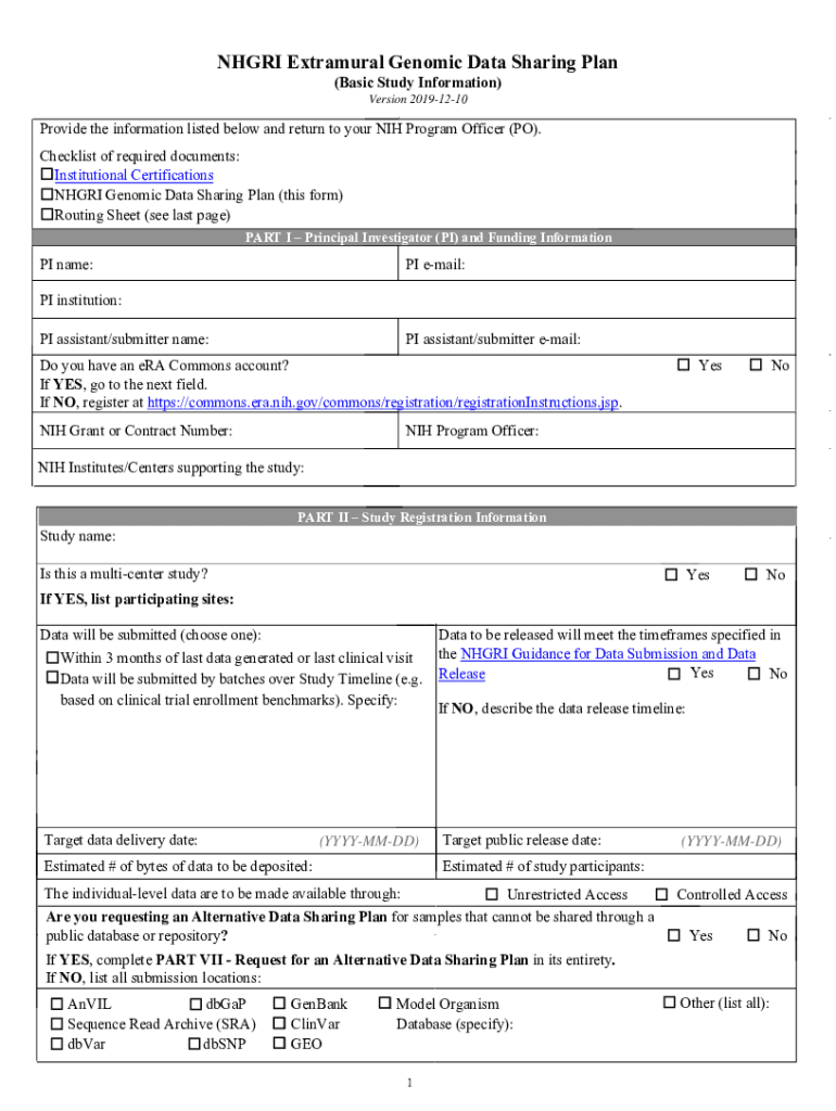 NH GRI Extramural Genomic Data Sharing Plan (Basic Study Information) Version 20191210Provide the information listed below and return to your NIH Program Officer (PO). Checklist of required documents:
