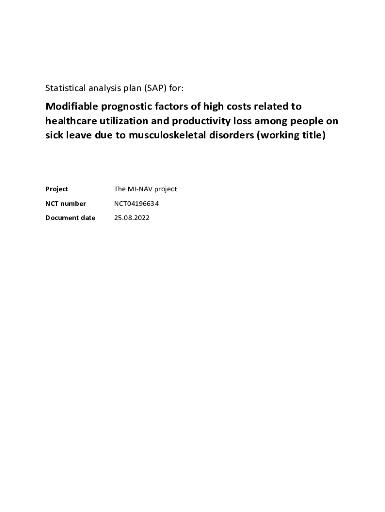 Statistical analysis plan (SAP) for:Modifiable prognostic factors of high costs related to healthcare utilization and productivity loss among people on sick leave due to musculoskeletal disorders