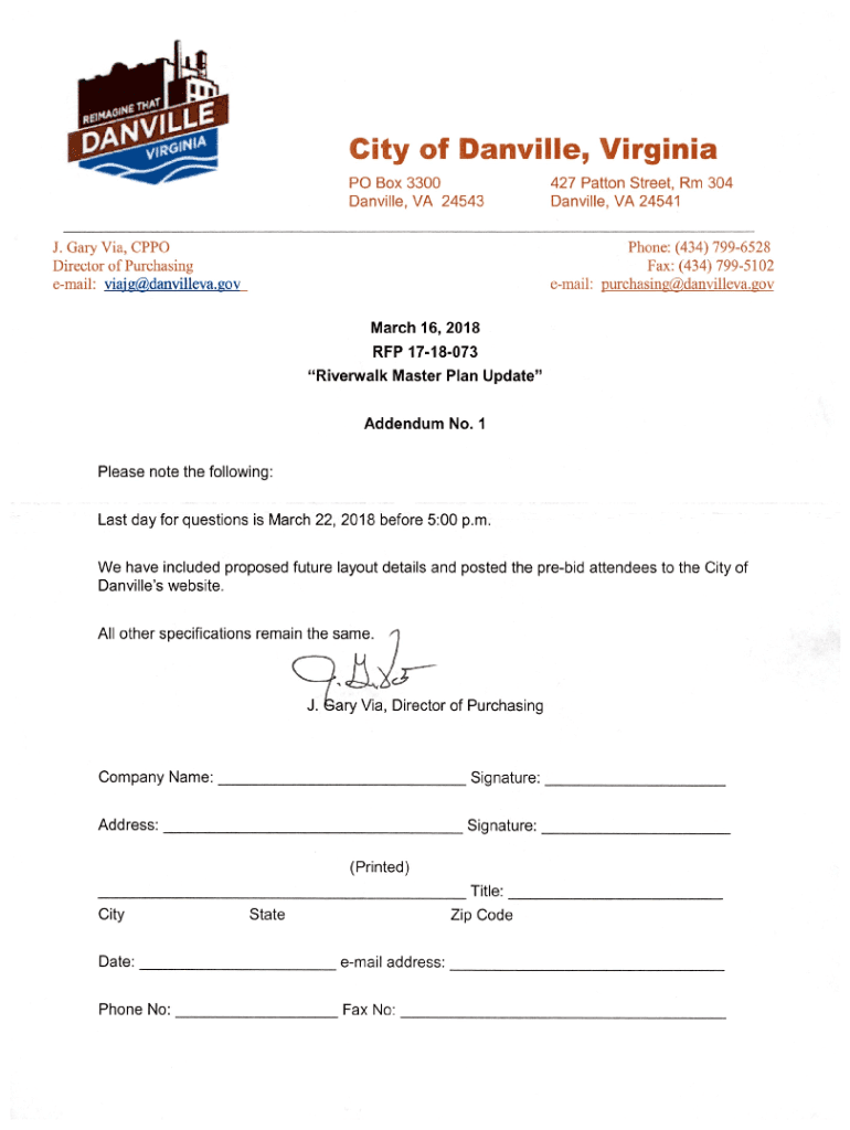 11.......1 R\” MAwILiveCityof Danville, Virginia J PO Box 3300 Danville, J.24543Danville, VA 24541Via, CPPOGaryDirector e-mail:VA427 Patton Street, Rm 304ofPhone: (434) 799 6528 Fax: (434) 799 5102Purchasingviajg@danvilleva.