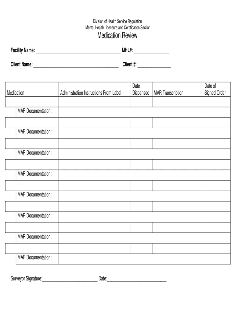 Division of Health Service Regulation Mental Health Licensure and Certification SectionMedication Review Facility Name: ___ MHL#: ___ Client Name: ___MedicationAdministration Instructions From Labelling