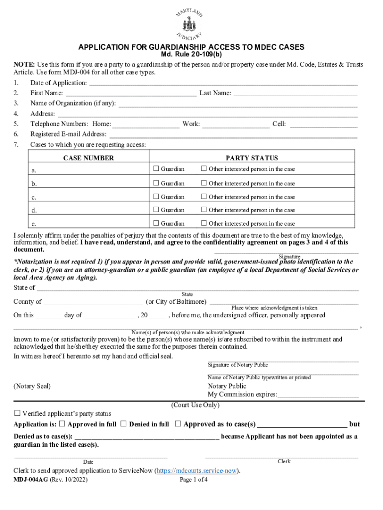 APPLICATION FOR GUARDIANSHIP ACCESS TO DEC CASES Md. Rule 20109(b) NOTE: Use this form if you are a party to a guardianship of the person and/or property case under Md. Code, Estates & Trusts Article.