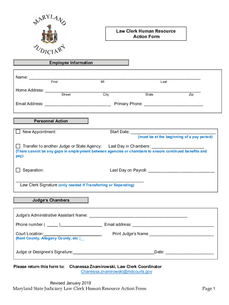 Law Clerk Human Resource Action FormEmployee Information Name: ___ FirstMILastHome Address: ___ StreetCityStateZipEmail Address: ___ Primary Phone: ___Personnel Action New Appointment:Start Date: