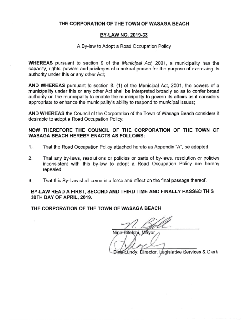 THE CORPORATION OF THE TOWN OF SAGA BEACH BYLAW NO.201933A Bylaw to Adopt a Road Occupation Policy WHEREAS pursuant to section 9 of the Municipal Act, 2001, a municipality has the capacity, rights,