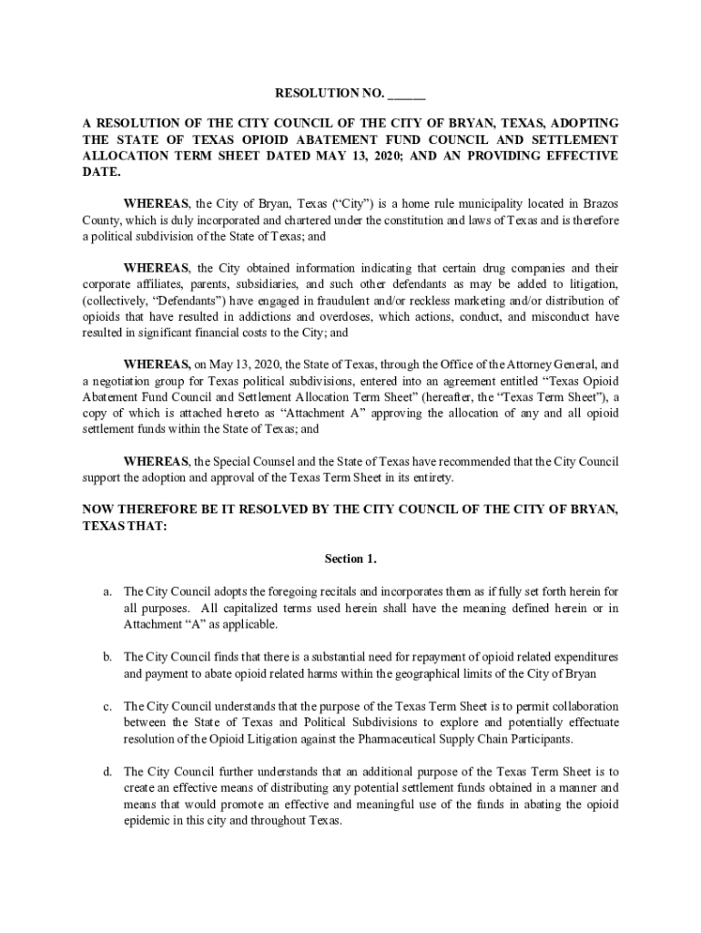 RESOLUTION NO. ___ A RESOLUTION OF THE CITY COUNCIL OF THE CITY OF BRYAN, TEXAS, ADOPTING THE STATE OF TEXAS OPIOID ABATEMENT FUND COUNCIL AND SETTLEMENT ALLOCATION TERM SHEET DATED MAY 13, 2020;