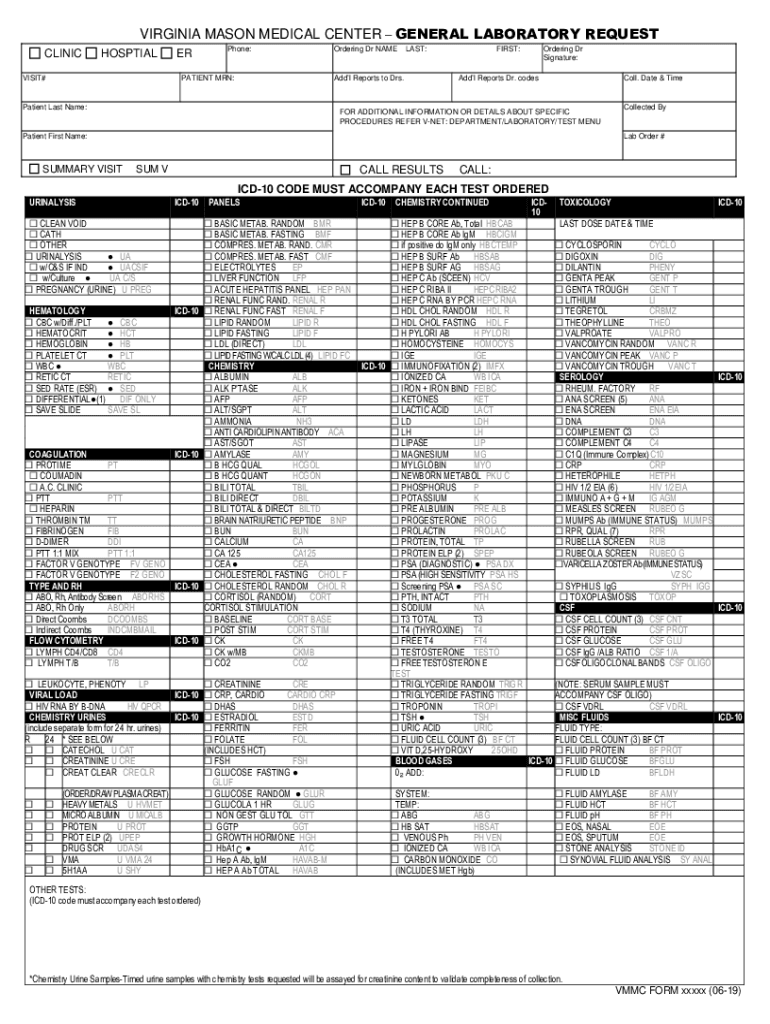 To complete the Virginia Mason Medical Center Laboratory Request Form, gather necessary patient information, including personal identification and relevant ICD-10 codes before starting.