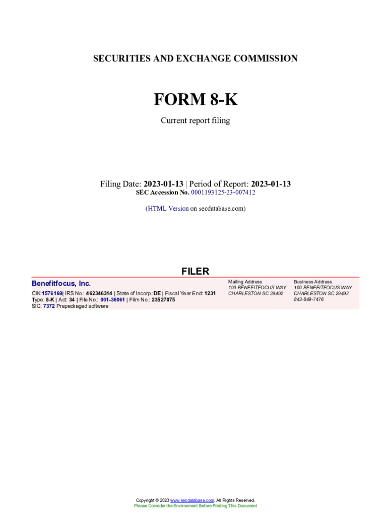 Get the free Benefitfocus, Inc. Form 8-K Current Event Report Filed 2023-01-13. Accession Number